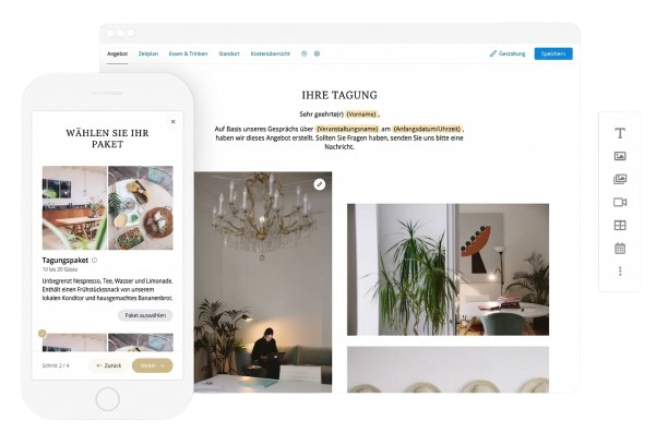Die Kombination aus RFP-Tool, Event-Dashboard und digitalen Vorschlägen bietet Ihnen die perfekte Synergie. Sobald Sie eine Anfrage über das RFP-Tool erhalten, bearbeiten Sie sie direkt im Dashboard und mit nur einem weiteren Klick versenden Sie im Handumdrehen einen Kostenvoranschlag. Das dauert keine Stunden, sondern nur wenige Minuten.